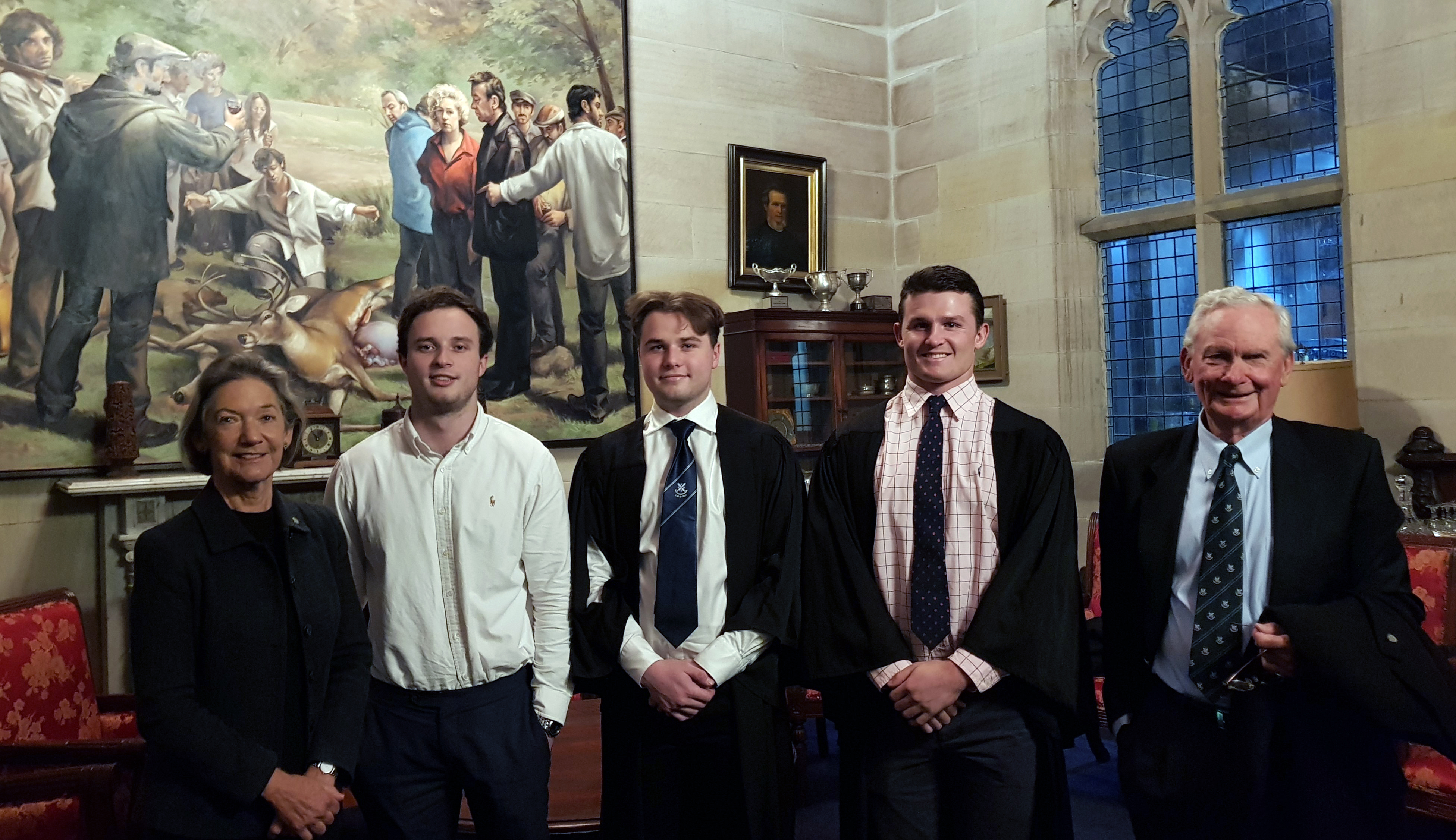 Peter and Libby recently met with the 2019 Plaskitt Family Scholarship recipients over Formal Dinner at the College. Fergus Bragg (from Aberdeen, NSW) and Liam Brandwood (from Wellington, NZ) are both currently in their third year at St Andrew’s and thoroughly enjoying their time here. They both discussed how integrated they have become in Drews life and especially with its sporting culture. This year, Fergus led the Rawson Rugby team to victory and Liam was a member of the successful Rawson cricket team. Whilst Fergus is pursuing a Bachelor of Economics at the University of Sydney, which echoes Peter’s own studies, Liam is studying for a Bachelor of Architecture, but both students agree that they are passionate about their courses and are excelling in their fields. An addition to the evening was Liam’s brother, Sam Brandwood, a recent alumnus who the Plaskitt Family also assisted as part of their scholarship the year previous. Although Sam has moved on from Andrew’s after graduating with a degree in Economics, he still took up the opportunity to see Peter and Libby again, as being the recipient of a scholarship comes with a long-lasting feeling of gratitude.